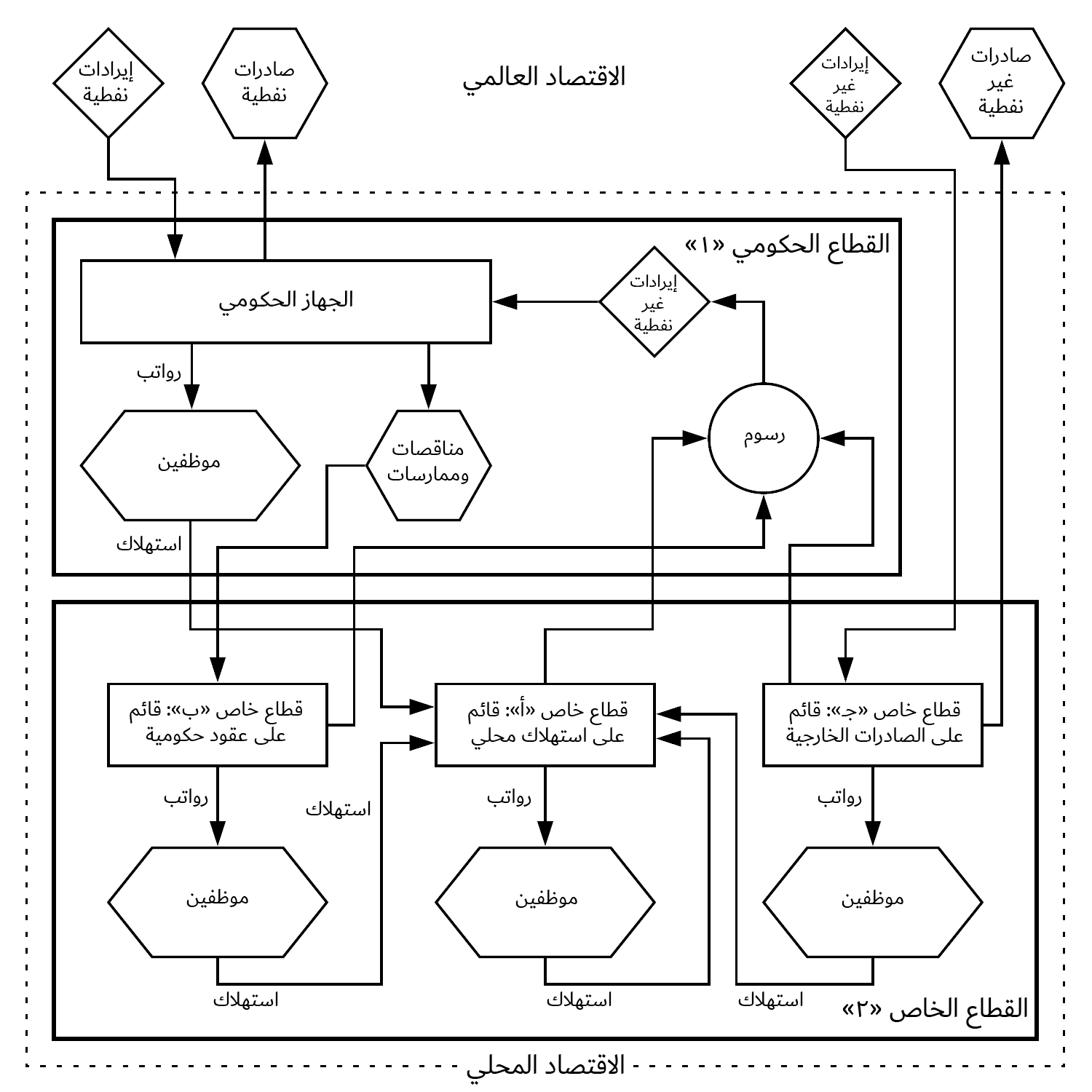 ولعل التحدي يكمن هنا في قلب موازين المعادلة، وذلك من خلال نقل هذا الاقتصاد إلى اقتصاد جديد، وتغيير مفاهيمه، وإعادة تشكيل معناه. نقلة يكون بها وزن الاعتماد على «جـ» أكبر من وزن الاعتماد على «١»، أي اقتصاد قائم على إيرادات تصدير القطاع الخاص –إنتاجيته–، لا اقتصاد قائم على إيرادات القطاع الحكومي الناتجة من تصدير النفط –أو أي مورد طبيعي آخر– إلى الخارج.