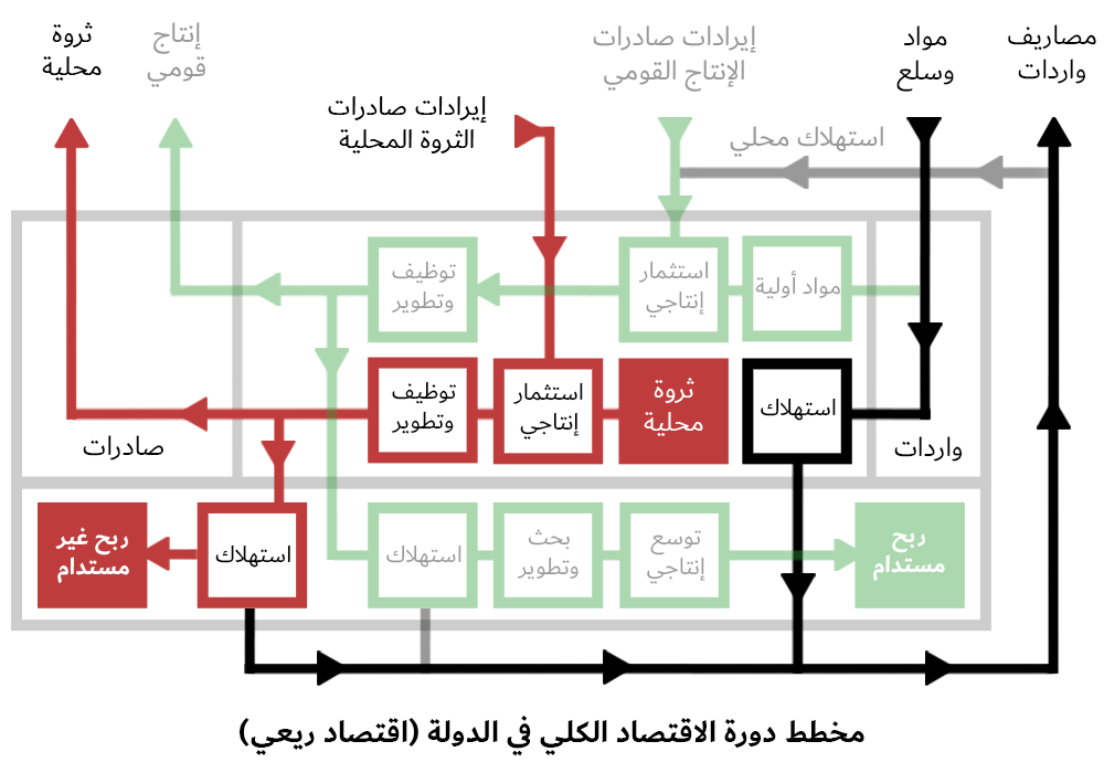 المخطط السابق مثال حي على دورة الاقتصاد الكلي في دولة ريعية، على افتراض توافقها مع الخصائص المذكورة بالدراسة. يُظهر المخطط (باللون الأحمر) الاعتماد الكلي لاقتصاد هذه الدولة على إيرادات صادراتها من الثروة المحلية، يتم استثمارها في الإنتاج والتصدير والتوظيف، ويستهلك جزء منها في مصاريف أخرى كمؤسسات الدولة وهيئاتها، ويتبقى منها الربح غير المستدام. لا شك في أن هذا الربح سيتوقف فور انتهاء صلاحية الثروة المحلية التي هي سبب ريعية هذا الاقتصاد. أما المخطط (باللون الأخضر) فما هو بذاك الوزن في التأثير على الاقتصاد الكلي للدولة. فاعتماده بالغالب على استهلاك المخطط الأحمر، والذي هو بنهاية الأمر قائم على صادرات الثروة المحلية. ففي حال انتهاء تلك الثروة فالأمر بلا شك سيؤثر على كلا المخططين، الأحمر والأخضر. دول الخليج مثال جدير بالذكر. القطاع الخاص بشكل كامل، وفي جميع قطاعاته المتفرعة، تأثر سلبا جراء الخطط الحكومية في ترشيد الإنفاق، والسبب يكمن وراء اعتماد المخطط الأخضر على الأحمر.