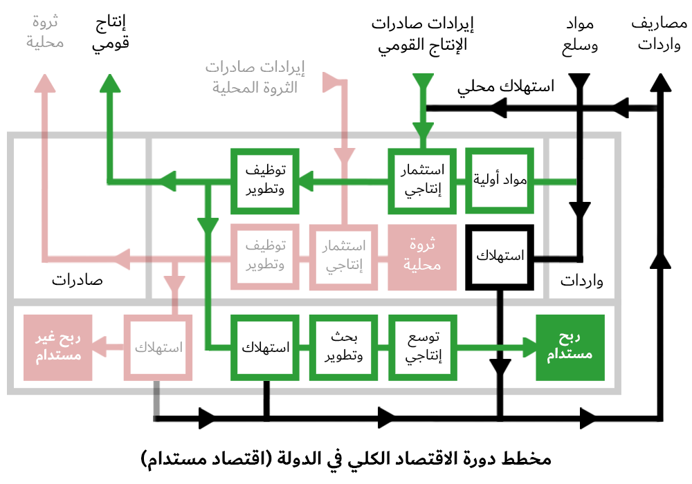 أولوية التحول إلى اقتصاد مستدام تأتي من خلال تركيز إيرادات صادرات الثروة المحلية في تحفيز إيرادات صادرات الإنتاج القومي، أي من خلال استغلال المخطط الأحمر في صنع مخطط أخضر متين. فالعمل يبدأ أولا في إلغاء الرسوم الجمركية في حال كانت الواردات مواد أولية. يأتي بعد ذلك رفع الرسوم الجمركية على الواردات التي تتوفر من خلال مُنتج محلي، الأمر الذي يحفز الاستهلاك المحلي تجاه نظيره الخارجي، وبه تنخفض مصاريف الواردات. وآخرا، استغلال إيرادات صادرات الثروة المحلية في تسهيلات وتوصيات ودعم للقطاع الخاص، ويكون التمييز بين شركات هذا القطاع مبني على حجم الصادرات الخاصة بكل منها. بذلك، يتوجه استهداف القطاع الخاص مباشرة إلى المستهلك الخارجي لا المحلي كما يحصل في دول الخليج الآن.