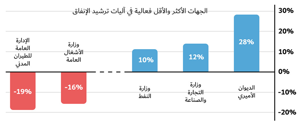 أما الجهات التي تخلفت في المراكز الأخيرة لترشيد الإنفاق بنفس الفترة، فهي الإدارة العامة للطيران المدني بالمركز الأخير؛ لارتفاع مصروفاتها بمعدل ١٩,١٪ بواقع ٢٢ مليون د.ك. سنويا. والمركز قبل الأخير كان من نصيب وزارة الأشغال العامة، إذ ارتفعت مصروفاتها بمعدل ١٦,١٪ بواقع ١٥٢ مليون د.ك. سنويا.