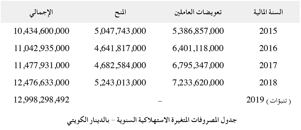 عند اعتبار تلك الملاحظات الإحصائية يتبين لنا أن «المصروفات الاستهلاكية المتغيرة» ترتفع بمعدل ٤,٣٪ سنويا، أي بمعدل ٥١٢ مليون د.ك. سنويا. والجدير بالذكر أن الارتفاع في هذا المتغير يعد ارتفاعا غير محدود، أي لا سقف له.