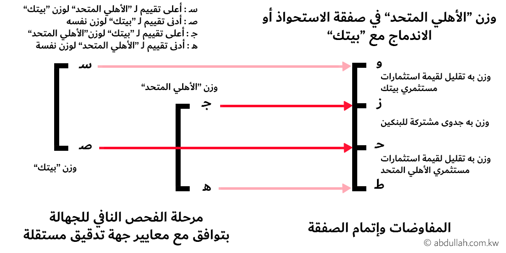 ففي هذا الفحص يقوم "الأهلي المتحد" في تقييم وزن "بيتك" في تلك الصفقة، ويرى به أن هذا الوزن غير مجد له إن تعدى "سـ". أما "بيتك" فلن يقبل بصفقة يكون فيها وزنه أدنى من "صـ". وفي الجهة المقابلة يقوم "بيتك" في تقييم وزن "الأهلي المتحد"، ويرى بأن هذا الوزن غير مجد أيضا إن تعدى "جـ". أما "الأهلي المتحد" فلن يقبل بصفقة يكون فيها وزنه أدنى من "هـ". بذلك، يكون وزن "الأهلي المتحد" المجدي والمحقق للمنفعة المشتركة بين الطرفين هو أدنى من "ز" وأعلى من "ح". فإن كان وزن "الأهلي المتحد" أعلى من "ز" فتلك الصفقة فيها تقليل لقيمة استثمارات مستثمري "بيتك"، وقد تكون بها شبهة اختلاس في صالح مستثمري "الأهلي المتحد". والعكس صحيح في حال كان سعر الصفقة أدنى من "ح".